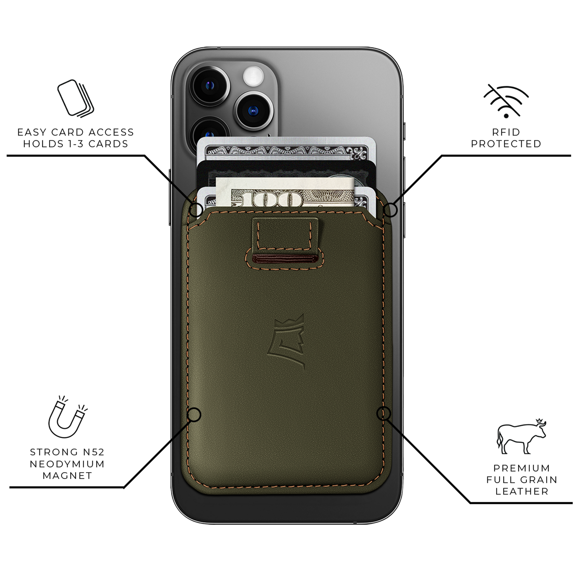 This high quality, minimal phone wallet adds style and functionality to your smart device. Mag Wallet has everything you love about a phone wallet plus our signature quick and easy access pull strap. Intentionally designed for 2-3 cards and a couple of folded up bills while magnetically adhering to your MagSafe phone case.