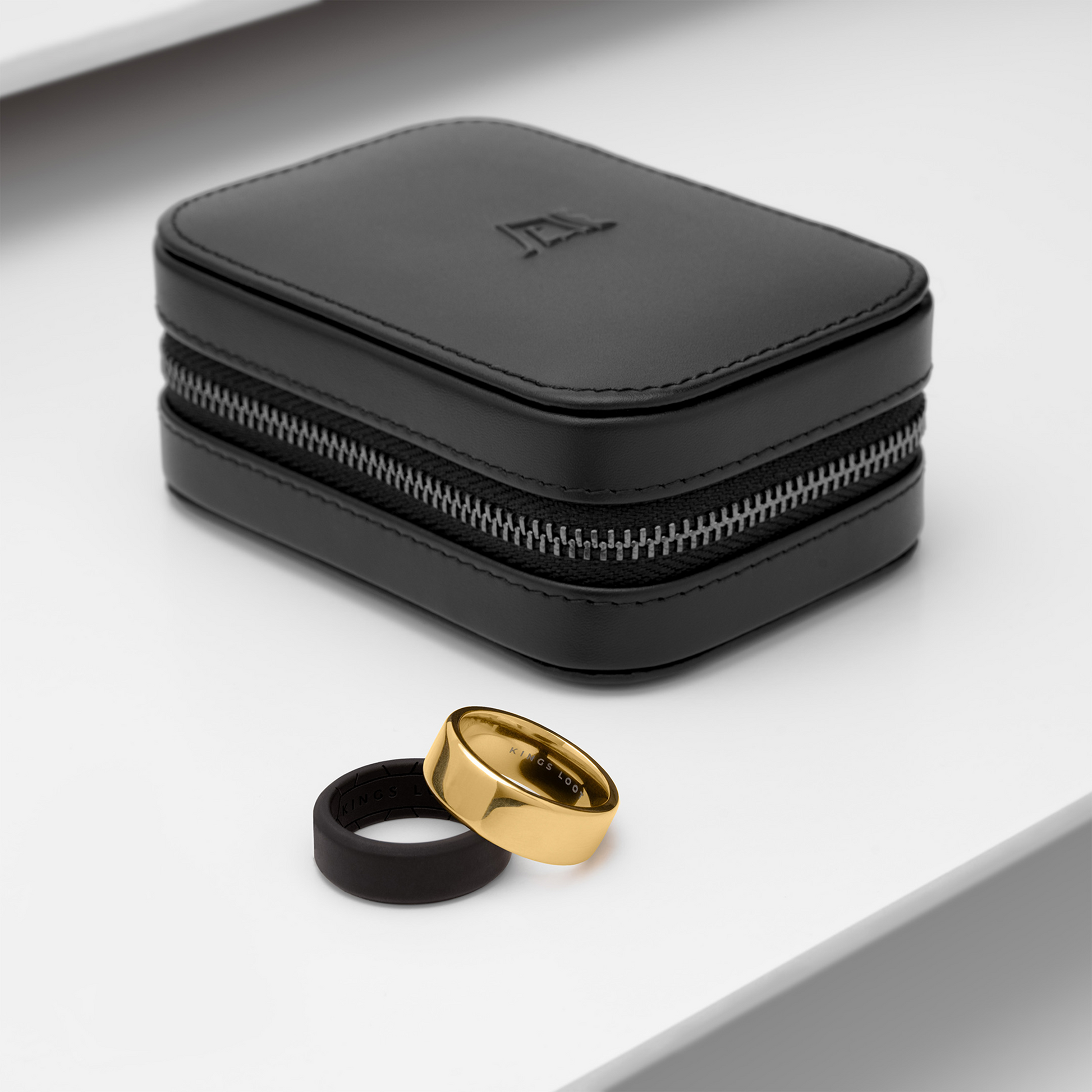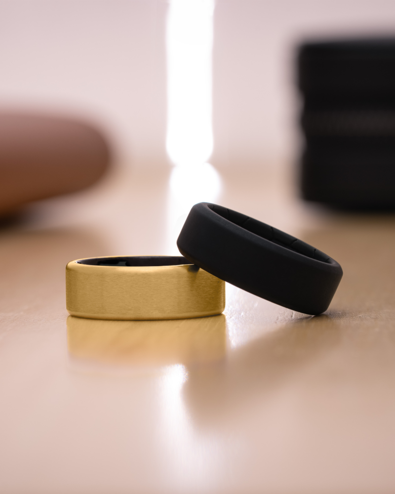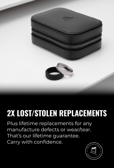 Each set includes an 8mm black silicone ring for workouts, travel, or hands-on work, plus our Onyx Black Vegetable Tanned Leather Travel Case with plush suede interior — a premium keepsake to protect your ring anywhere.